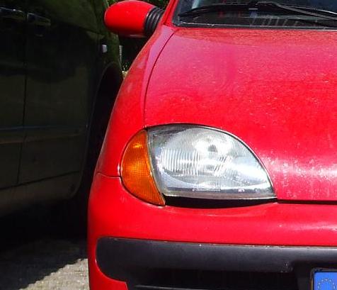 Eindelijk, de rode Seicento is weer compleet. Nadat ik de Italiaanse vanuit Surhuisterveen op de inrit te Zuidhorn had gezet (zie eerdere blog), viel me ineens op dat er onder de rechterkoplamp iets ontbrak. Net als een aantal andere autotypes heeft de Seicento wallen onder de ogen. Links was ze compleet, maar rechts ontwaarde ik een gapend gat onder de lamp. Slagregens en woeste sneeuwval hadden zo vrij spel.